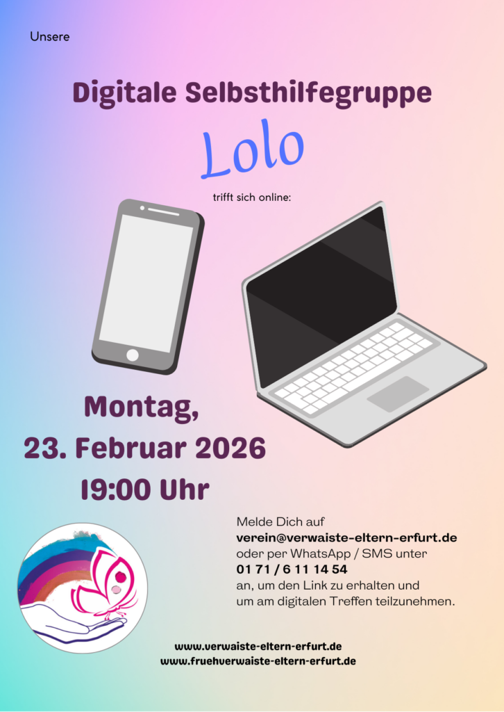 Die verwaisten Eltern der Selbsthilfegruppe „Lolo“ treffen sichjeden 4. Montag im Monat um 19:00 Uhr via Zoom.