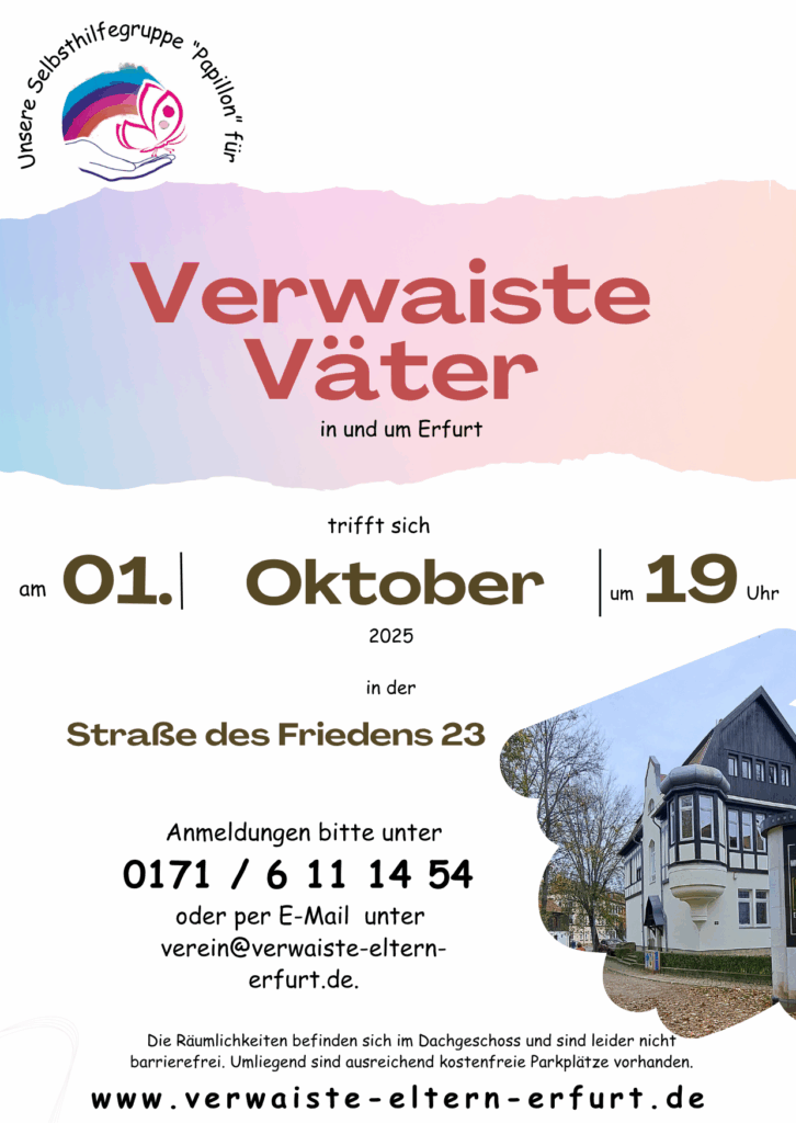 Die verwaisten Väter der Selbsthilfegruppe „Papillon“ treffen sich jeden 1. Mittwoch im Monat um 19:00 Uhr.